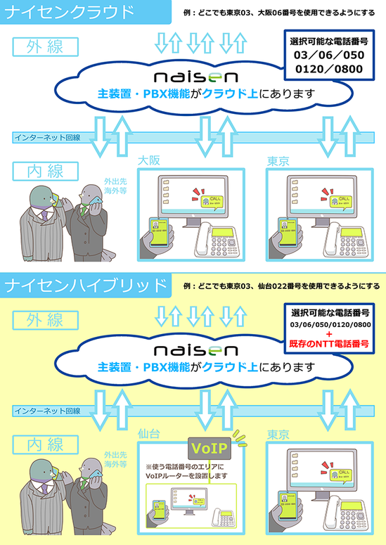外出先・拠点間・海外でも同じ番号で発着信・内線化。「ナイセン クラウド」の機能も利用可能。